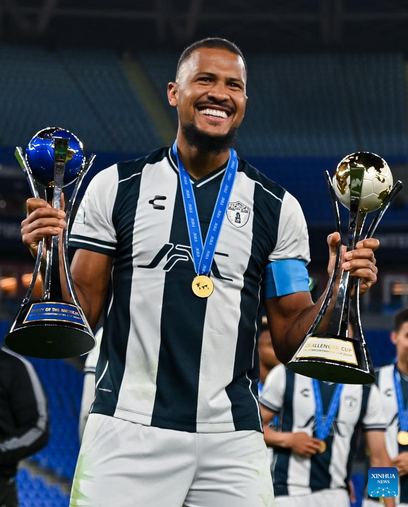DOHA, 15 diciembre, 2024 (Xinhua) -- Imagen del 14 de diciembre de 2024 de Salomón Rondón, de CF Pachuca, festejando con el trofeo después de ganar el partido de la Copa Challenger de la FIFA entre Al Ahly SC de Egipto y CF Pachuca de México, parte de la Copa Intercontinental de la FIFA 2024, en Doha, Qatar. (Xinhua/Nikku)