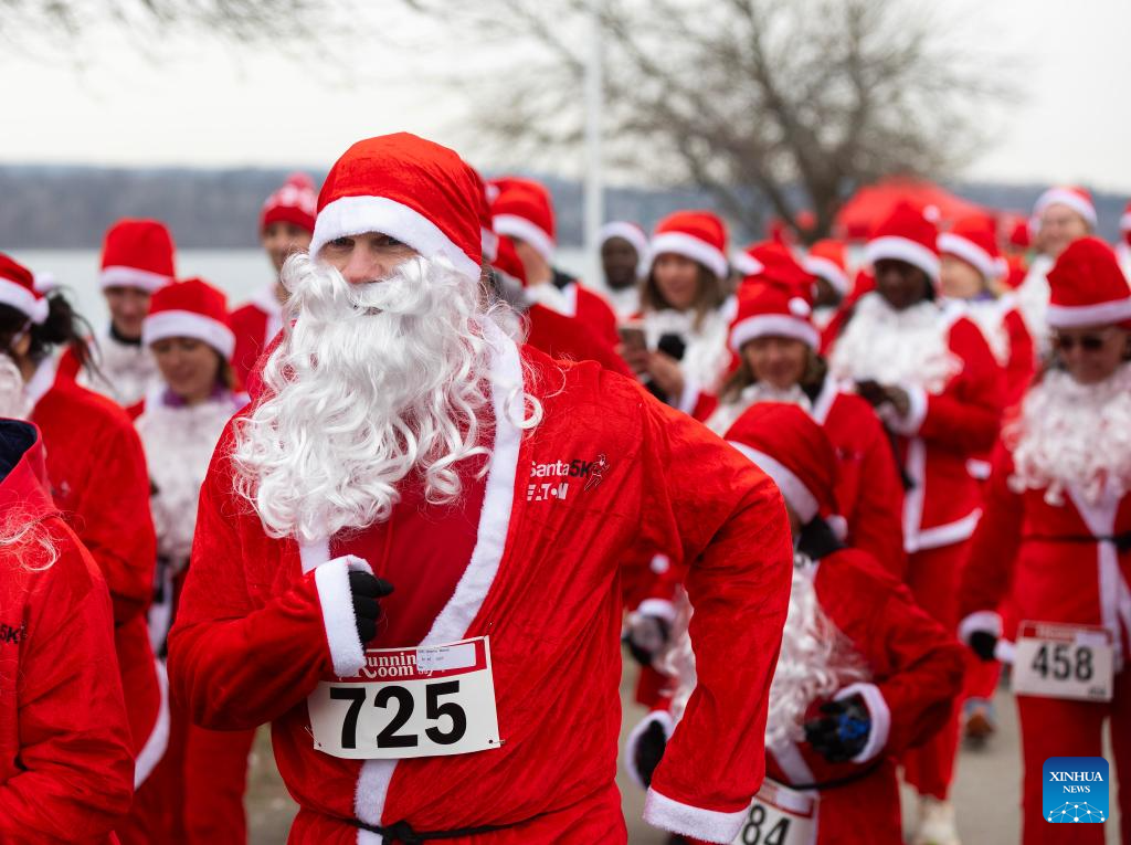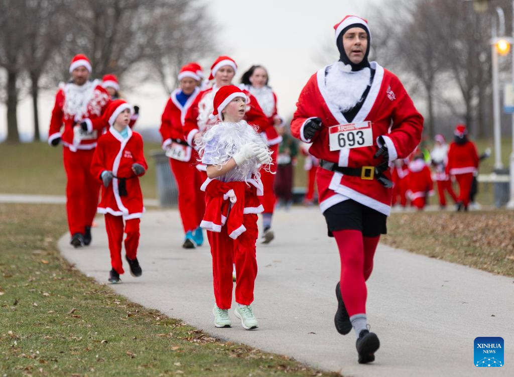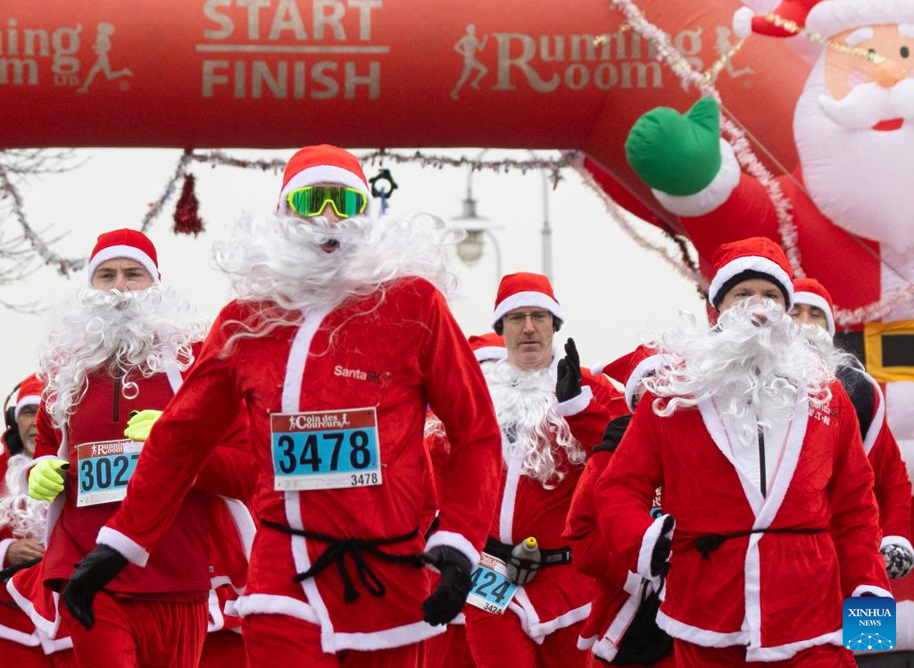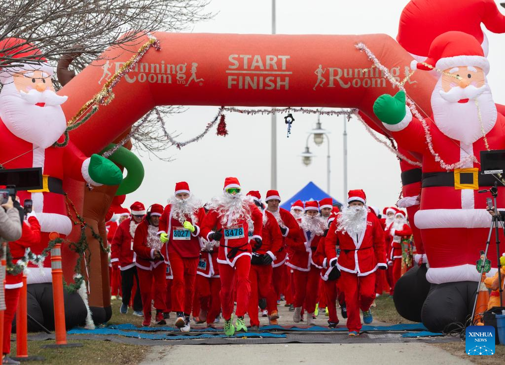 HAMILTON, 16 diciembre, 2024 (Xinhua) -- Imagen del 15 de diciembre de 2024 de personas disfrazadas de Santa Claus vistas durante la Carrera de Santa 2024, en Hamilton, Ontario, Canadá. Más de 600 personas participaron en este evento anual aquí el domingo. (Xinhua/Zou Zheng)