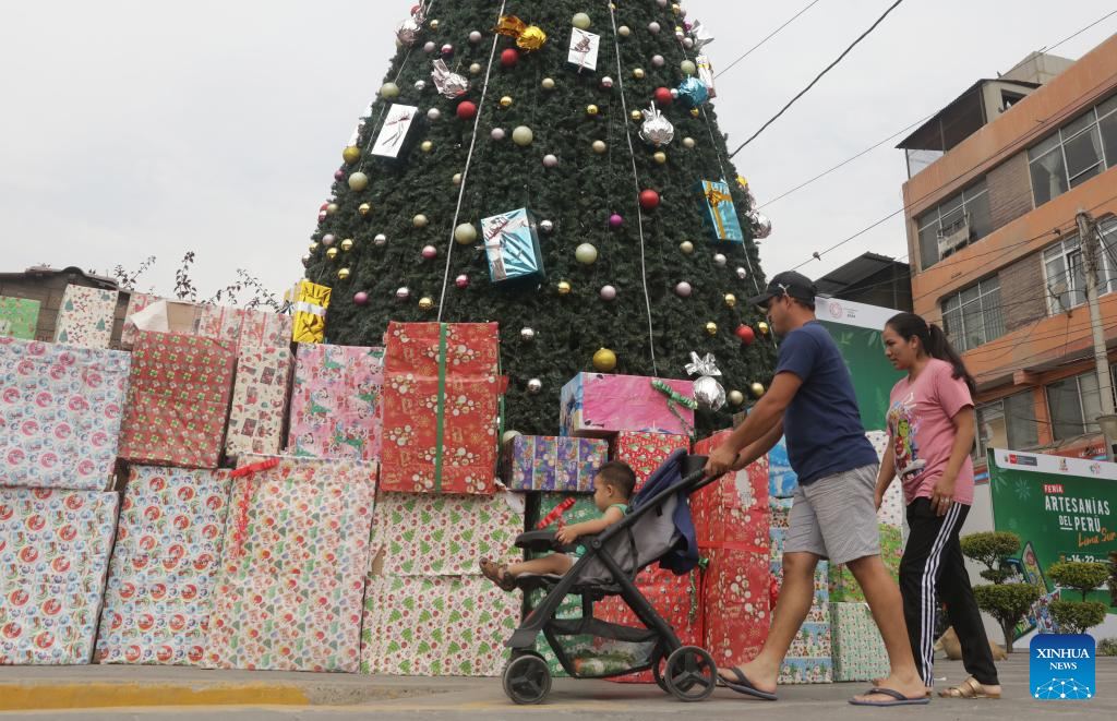 LIMA, 16 diciembre, 2024 (Xinhua) -- Personas caminan frente a un árbol de Navidad, en el distrito de Lurín, en el sur de Lima, Perú, el 16 de diciembre de 2024. (Xinhua/Mariana Bazo)