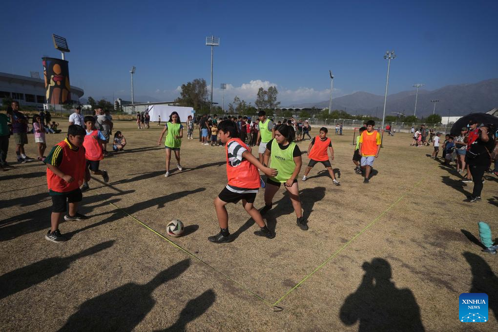 SANTIAGO, 16 diciembre, 2024 (Xinhua) -- Imagen cedida por la Presidencia de Chile el 15 de diciembre de 2024 de jóvenes jugando fútbol durante el Festival Navideño 2024, en el Parque Estadio Nacional, en Santiago, capital de Chile. (Xinhua/Presidencia de Chile)
