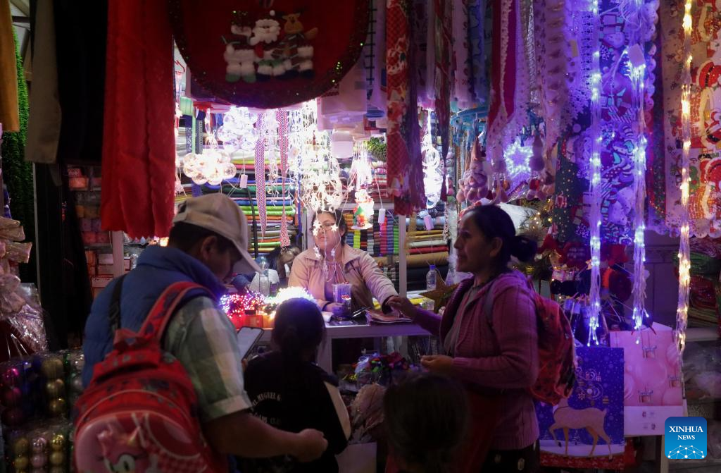 LIMA, 16 diciembre, 2024 (Xinhua) -- Una vendedora atiende un puesto de adornos navideños, en el distrito de Lurín, en el sur de Lima, Perú, el 16 de diciembre de 2024. (Xinhua/Mariana Bazo)