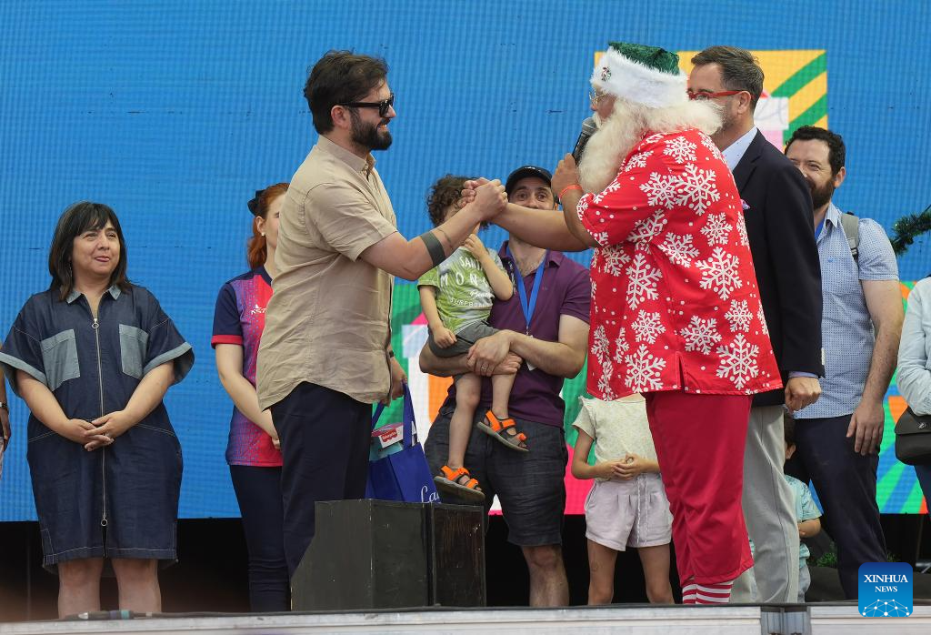 SANTIAGO, 16 diciembre, 2024 (Xinhua) -- Imagen cedida por la Presidencia de Chile el 15 de diciembre de 2024 del presidente chileno, Gabriel Boric (i), estrechando la mano de un hombre disfrazado de Santa Claus (d), durante el Festival Navideño 2024, en el Parque Estadio Nacional, en Santiago, capital de Chile. (Xinhua/Presidencia de Chile)