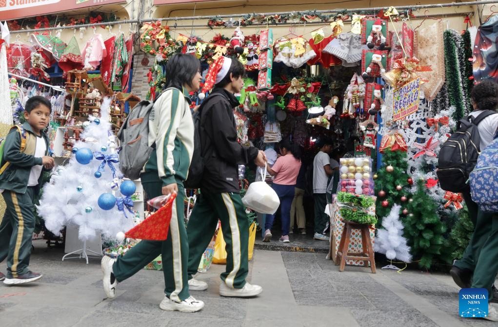 LIMA, 16 diciembre, 2024 (Xinhua) -- Personas caminan frente a una tienda de productos navideños, en el distrito de Lurín, en el sur de Lima, Perú, el 16 de diciembre de 2024. (Xinhua/Mariana Bazo)