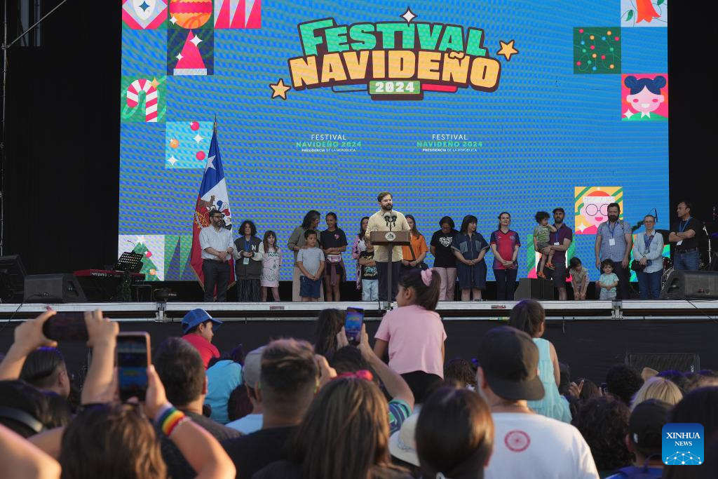 SANTIAGO, 16 diciembre, 2024 (Xinhua) -- Imagen cedida por la Presidencia de Chile el 15 de diciembre de 2024 del presidente chileno, Gabriel Boric (c-atrás), pronunciando un discurso durante el Festival Navideño 2024, en el Parque Estadio Nacional, en Santiago, capital de Chile. (Xinhua/Presidencia de Chile)