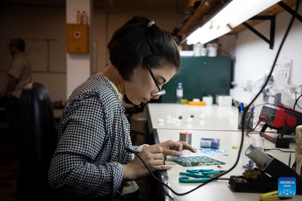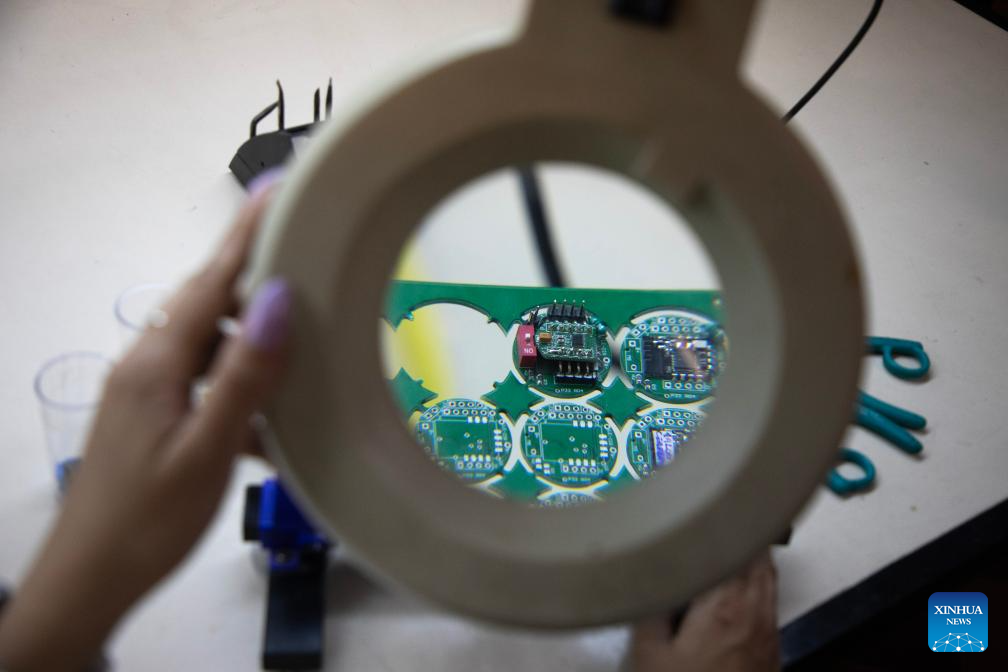 HURLINGHAM, 14 diciembre, 2024 (Xinhua) -- Imagen del 10 de diciembre de 2024 de Natalia Jewgeniuk, técnica electrónica del Laboratorio de Agroelectrónica del Instituto de Ingeniería Rural del Instituto Nacional de Tecnología Agropecuaria (INTA) sede Castelar, trabajando sobre una plantilla de plaquetas para la construcción de "cerezas electrónicas", en la localidad de Hurlingham, Argentina. Un grupo de especialistas en agrotecnología desarrolló en Argentina una innovadora "cereza electrónica", un dispositivo equipado con sensores que detectan movimientos bruscos y golpes que se integra en los procesos de empaque y transporte de esta fruta y que tiene como función principal el proporcionar datos clave para reducir los daños mecánicos durante el manejo de las cerezas y, de este modo, mejorar su valor comercial en el mercado de exportación. (Xinhua/Martín Zabala)