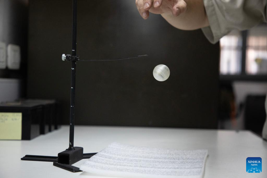HURLINGHAM, 14 diciembre, 2024 (Xinhua) -- Imagen del 10 de diciembre de 2024 del ingeniero en Electrónica y doctor en Ciencias Aplicadas, Andrés Moltoni, responsable del Laboratorio de Agroelectrónica del Instituto de Ingeniería Rural del Instituto Nacional de Tecnología Agropecuaria (INTA) sede Castelar, realizando un ensayo de calibración de impacto de una cápsula contenedora de una "cereza electrónica", en el laboratorio, en la localidad de Hurlingham, Argentina. Un grupo de especialistas en agrotecnología desarrolló en Argentina una innovadora "cereza electrónica", un dispositivo equipado con sensores que detectan movimientos bruscos y golpes que se integra en los procesos de empaque y transporte de esta fruta y que tiene como función principal el proporcionar datos clave para reducir los daños mecánicos durante el manejo de las cerezas y, de este modo, mejorar su valor comercial en el mercado de exportación. (Xinhua/Martín Zabala)
