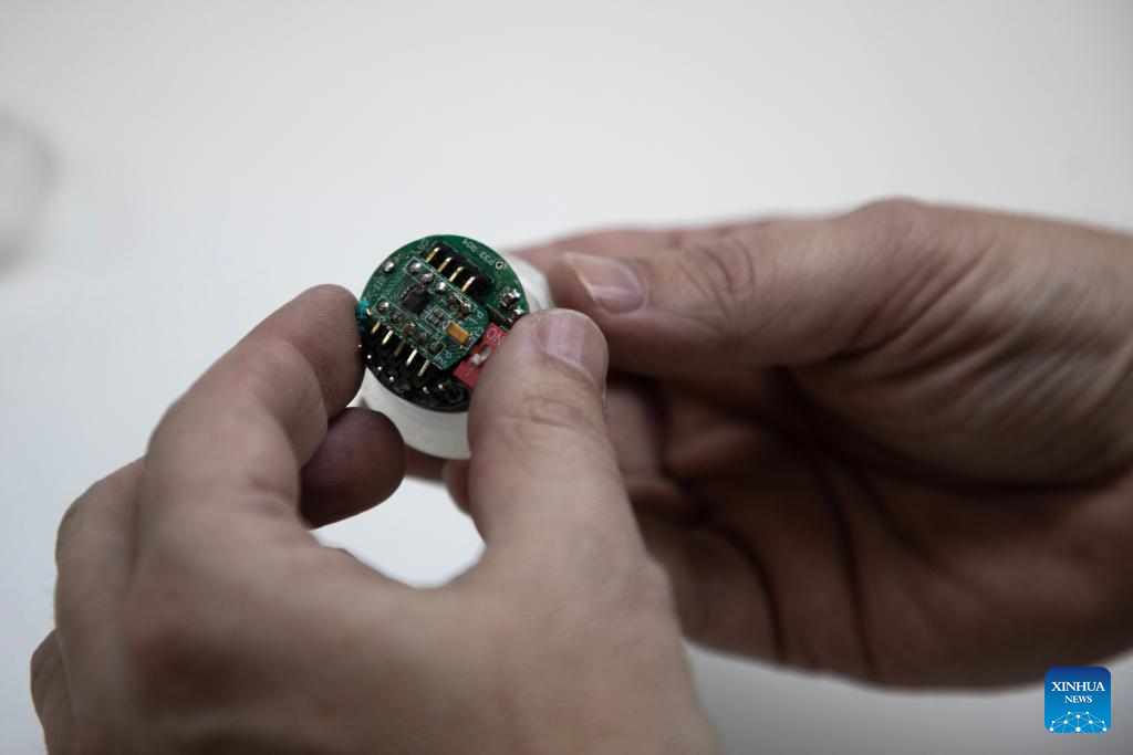 HURLINGHAM, 14 diciembre, 2024 (Xinhua) -- Imagen del 10 de diciembre de 2024 del ingeniero en Electrónica y doctor en Ciencias Aplicadas, Andrés Moltoni, responsable del Laboratorio de Agroelectrónica del Instituto de Ingeniería Rural del Instituto Nacional de Tecnología Agropecuaria (INTA) sede Castelar, montando una "cereza electrónica" en una cápsula para la realización de un ensayo de calibración de impacto, en la localidad de Hurlingham, Argentina. Un grupo de especialistas en agrotecnología desarrolló en Argentina una innovadora "cereza electrónica", un dispositivo equipado con sensores que detectan movimientos bruscos y golpes que se integra en los procesos de empaque y transporte de esta fruta y que tiene como función principal el proporcionar datos clave para reducir los daños mecánicos durante el manejo de las cerezas y, de este modo, mejorar su valor comercial en el mercado de exportación. (Xinhua/Martín Zabala)