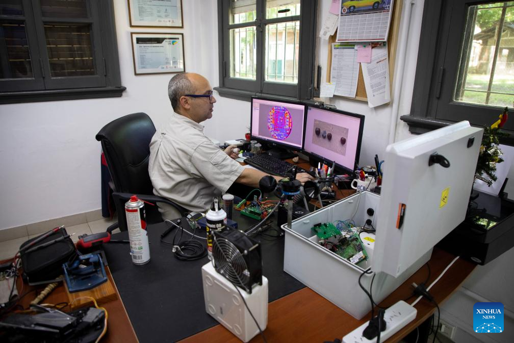 HURLINGHAM, 14 diciembre, 2024 (Xinhua) -- Imagen del 10 de diciembre de 2024 del ingeniero en Electrónica y doctor en Ciencias Aplicadas, Andrés Moltoni, responsable del Laboratorio de Agroelectrónica del Instituto de Ingeniería Rural del Instituto Nacional de Tecnología Agropecuaria (INTA) sede Castelar, trabajando en su oficina, en la localidad de Hurlingham, Argentina. Un grupo de especialistas en agrotecnología desarrolló en Argentina una innovadora "cereza electrónica", un dispositivo equipado con sensores que detectan movimientos bruscos y golpes que se integra en los procesos de empaque y transporte de esta fruta y que tiene como función principal el proporcionar datos clave para reducir los daños mecánicos durante el manejo de las cerezas y, de este modo, mejorar su valor comercial en el mercado de exportación. (Xinhua/Martín Zabala)