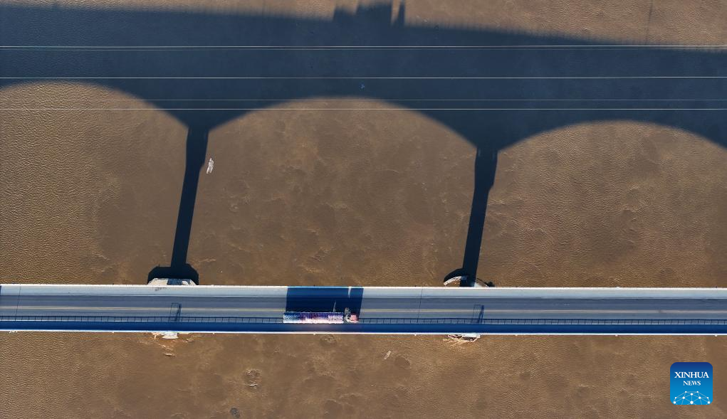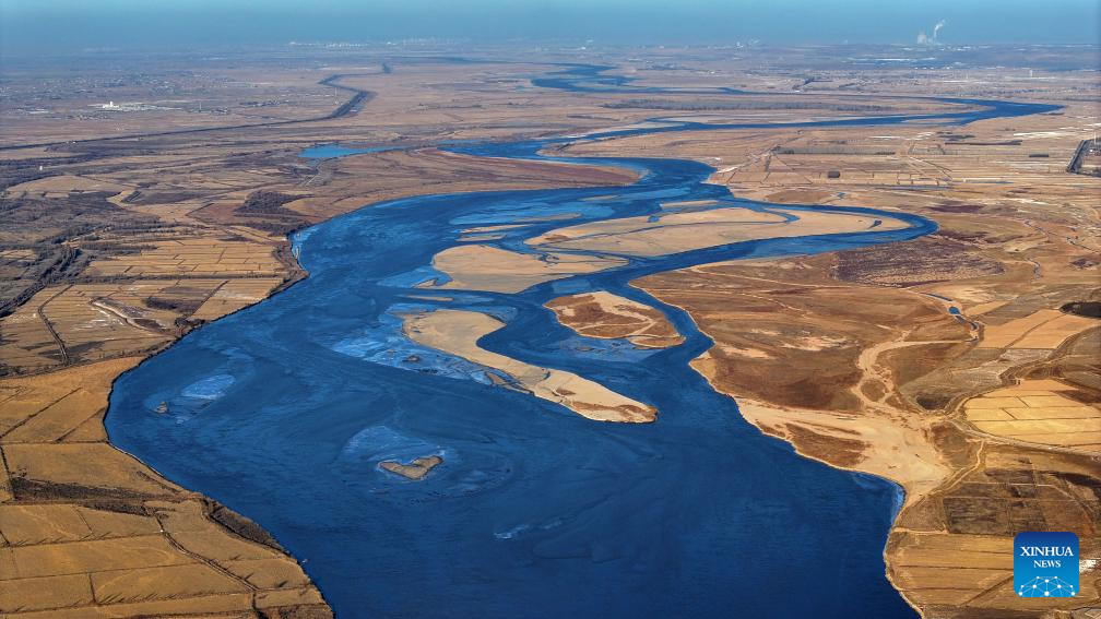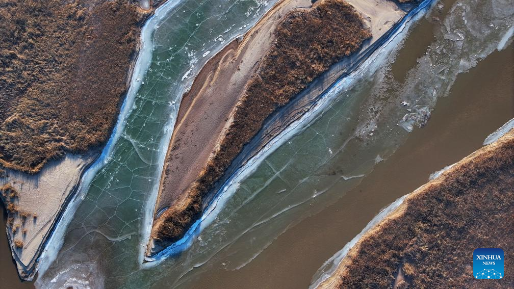 YINCHUAN, 5 enero, 2025 (Xinhua) -- Vista aérea tomada con un dron el 5 de enero de 2025 del Río Amarillo, en Shizuishan, en la región autónoma hui de Ningxia, en el noroeste de China. (Xinhua/Wang Peng)