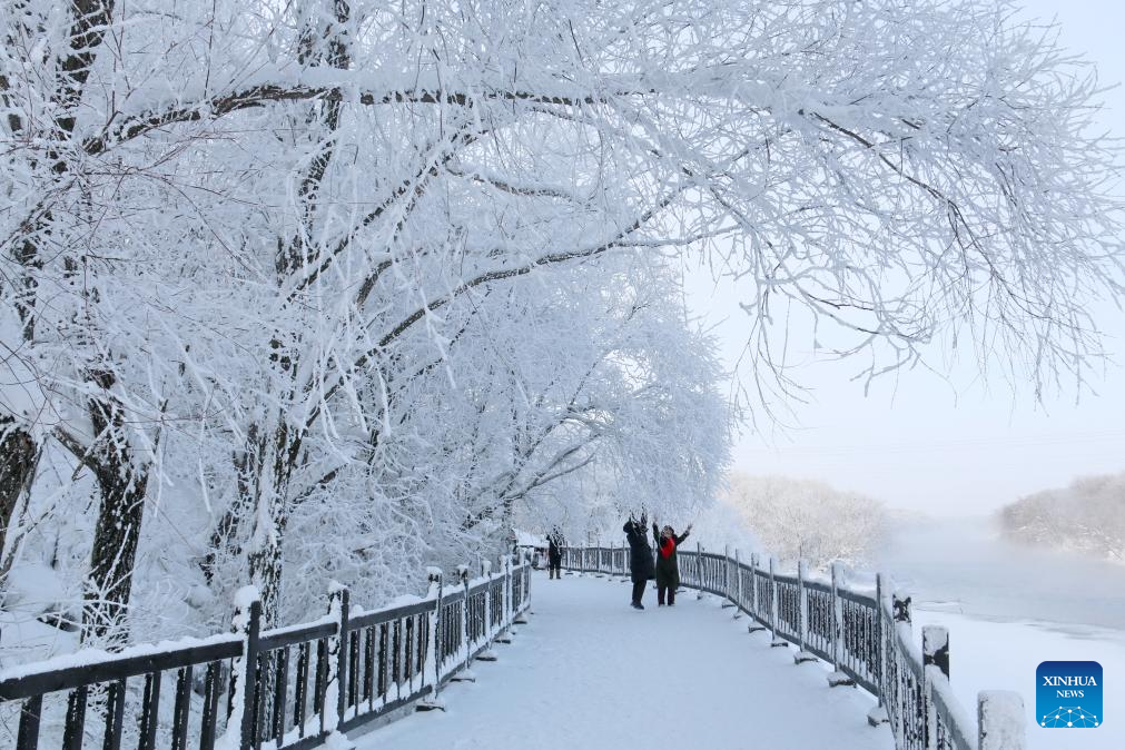 HARBIN, 5 enero, 2025 (Xinhua) -- Imagen del 4 de enero de 2025 de personas disfrutando del paisaje de escarcha enun punto escénico, en Wudalianchi, en la provincia de Heilongjiang, en el noreste de China. (Xinhua/Qu Yubao)