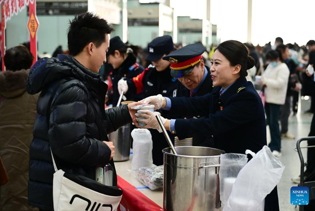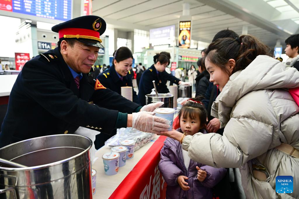 BEIJING, 6 enero, 2025 (Xinhua) -- Empleados sirven gachas de Laba para pasajeros en la Estación de Ferrocarril del Sur de Hefei, en Hefei, en la provincia de Anhui, en el este de China, el 6 de enero de 2025. Diferentes actividades se llevaron a cabo a través del país para recibir el próximo Festival Laba, que se conmemora el 7 de enero este año. (Xinhua/Zhou Mu)