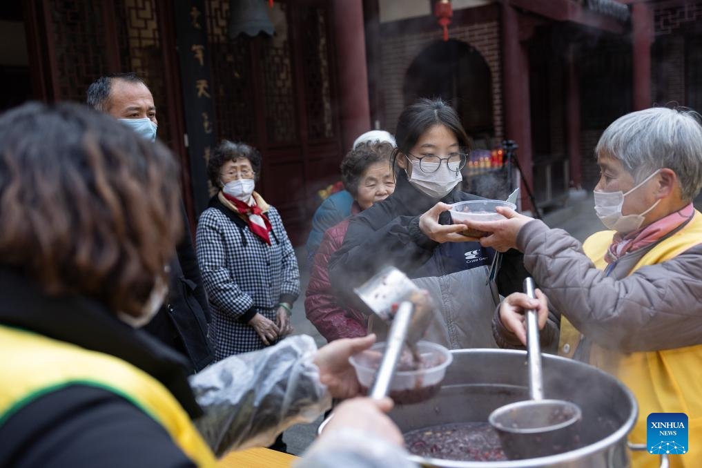 BEIJING, 6 enero, 2025 (Xinhua) -- Residentes reciben gachas de Laba, en el distrito de Wuxing de Huzhou, en la provincia de Zhejiang, en el este de China, el 6 de enero de 2025. Diferentes actividades se llevaron a cabo a través del país para recibir el próximo Festival Laba, que se conmemora el 7 de enero este año. (Xinhua/Yi Fan)