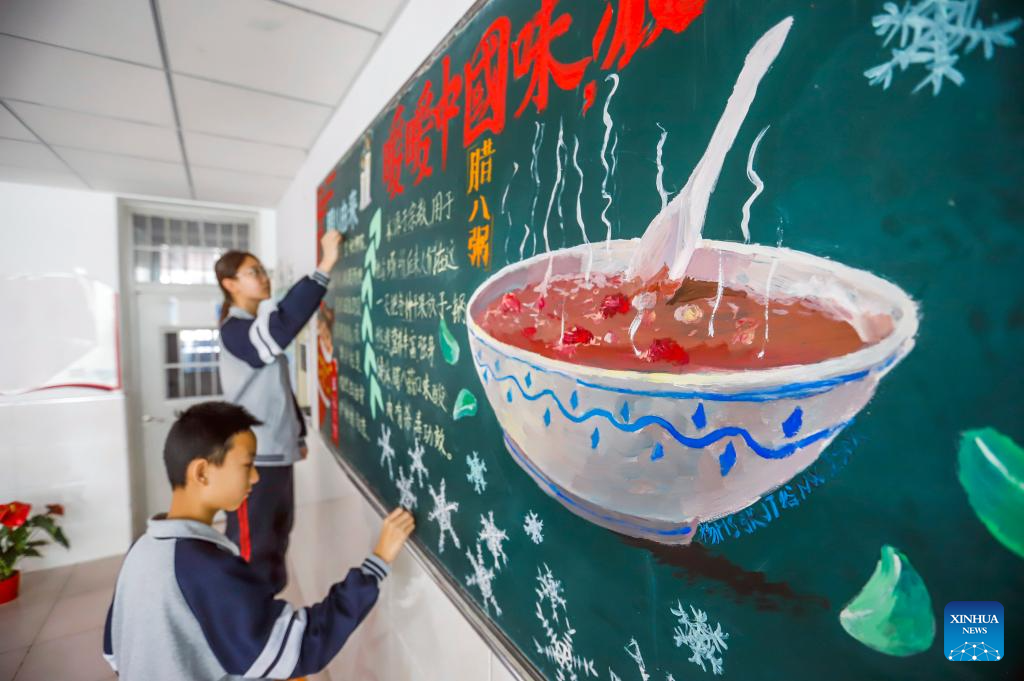 BEIJING, 6 enero, 2025 (Xinhua) -- Estudiantes dibujan diseños festivos en un pizarrón en una escuela secundaría, en Zunhua, en la provincia de Hebei, en el norte de China, el 6 de enero de 2025. Diferentes actividades se llevaron a cabo a través del país para recibir el próximo Festival Laba, que se conmemora el 7 de enero este año. (Xinhua/Liu Mancang)