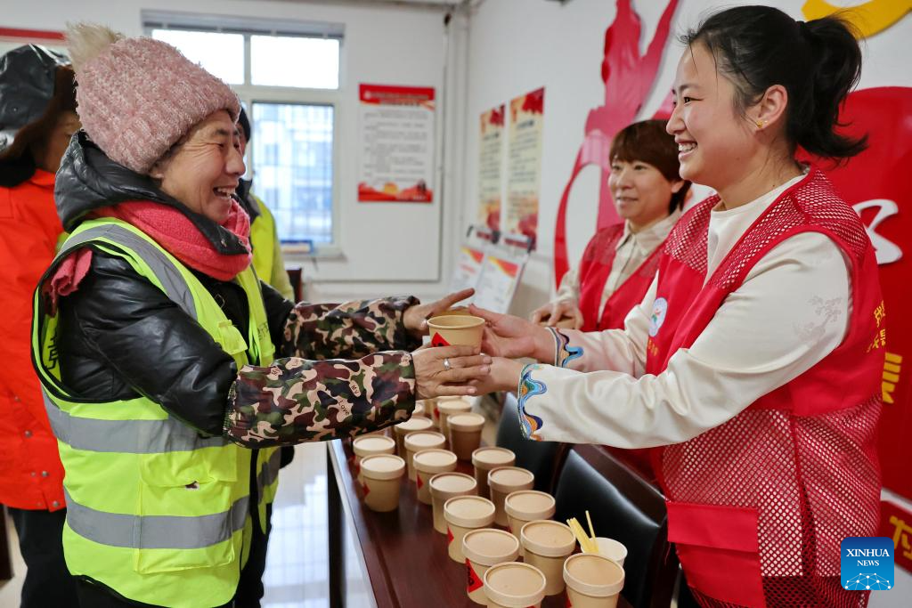 BEIJING, 6 enero, 2025 (Xinhua) -- Voluntarios sirven gachas de Laba gratuitos para empleados de saneamiento, en el distrito de Haigang de Qinhuangdao, en la provincia de Hebei, en el norte de China, el 6 de enero de 2025. Diferentes actividades se llevaron a cabo a través del país para recibir el próximo Festival Laba, que se conmemora el 7 de enero este año. (Xinhua/Cao Jianxiong)