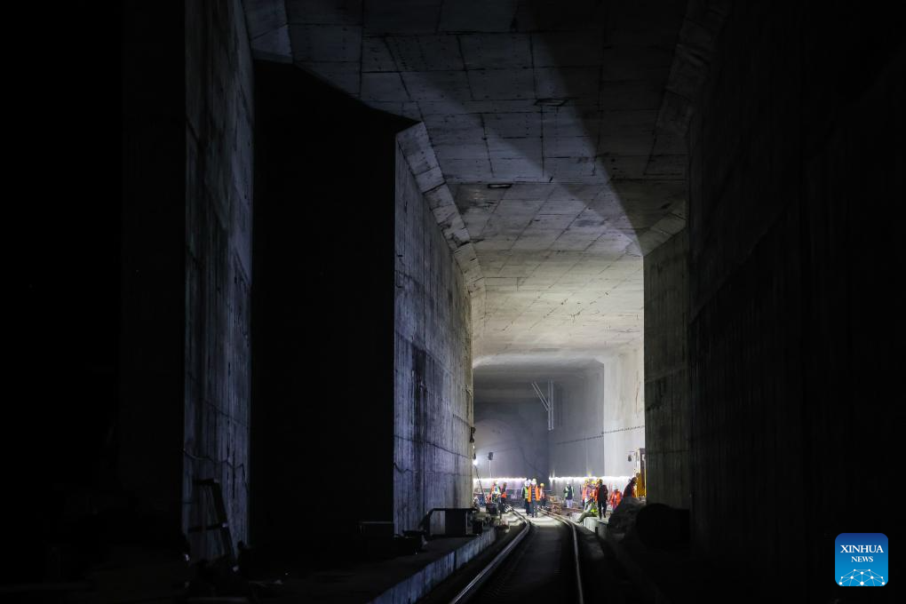 GUANGZHOU, 6 enero, 2025 (Xinhua) -- Trabajadores de la construcción laboran en la Estación de Dayuan del ferrocarril interurbano del anillo este de Guangfo (Guangzhou-Foshan), en Guangzhou, en la provincia de Guangdong, en el sur de China, el 6 de enero de 2025. Los trabajos de tendido de vías del ferrocarril interurbano del anillo este de Guangfo, finalizaron el lunes. El proyecto es una sección del ferrocarril interurbano circular Guangzhou-Foshan y también una parte importante de la red ferroviaria interurbana de la Gran Area de la Bahía de Guangdong-Hong Kong-Macao. (Xinhua/Liu Dawei)