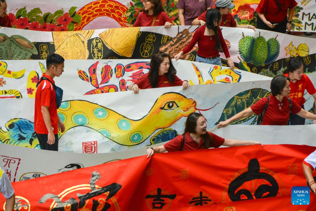 KUALA LUMPUR, 6 enero, 2025 (Xinhua) -- Imagen del 5 de enero de 2025 de estudiantes mostrando un pergamino largo creado para conmemorar el Año de la Serpiente, en Kuala Lumpur, Malasia. Alrededor de 160 estudiantes participaron en la creación de un pergamino largo con temática de serpiente para celebrar el próximo Año de la Serpiente. (Xinhua/Chong Voon Chung)