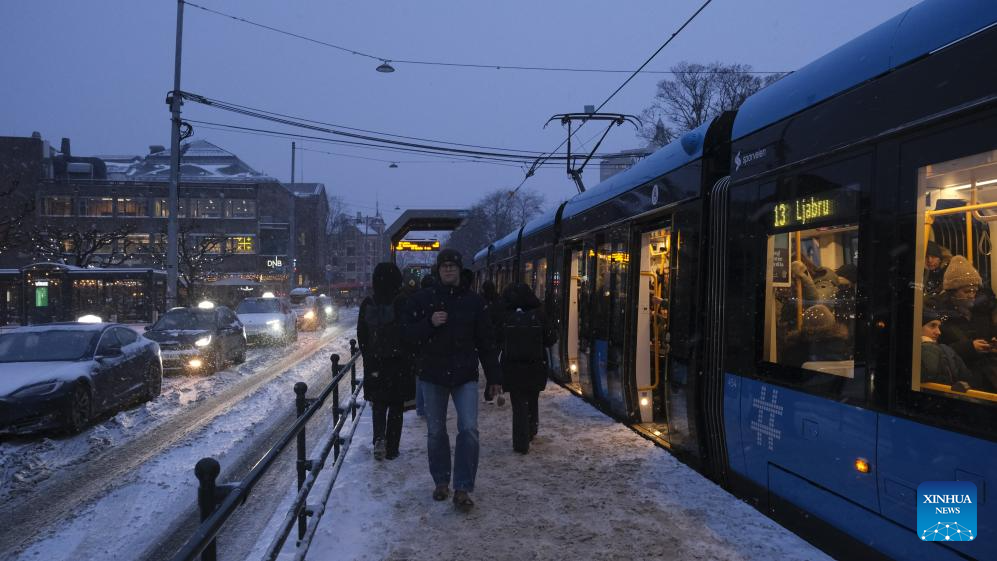 OSLO, 7 enero, 2025 (Xinhua) -- Imagen del 6 de enero de 2025 de pasajeros subiendo y bajando de un tranvía en la nieve, en Oslo, capital de Noruega. Europa está lidiando con una poderosa ola de clima invernal extremo, incluyendo fuertes nevadas, aguanieve y tormentas, que han alterado el transporte y la infraestructura en todo el continente, dejando a los viajeros varados y a las comunidades locales luchando por controlar el caos. (Xinhua/Zhang Yuliang)