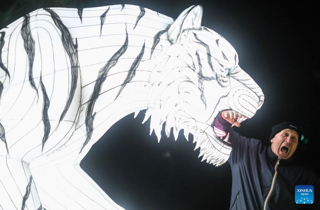 ROMA, 7 enero, 2025 (Xinhua) -- Imagen del 6 de enero de 2025 de un hombre visitando una exposición de linternas chinas en un parque, en Roma, Italia. (Xinhua/Li Jing)