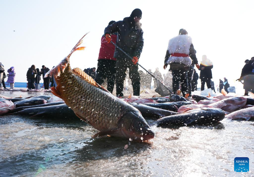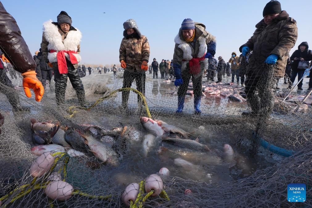 SHENYANG, 11 enero, 2025 (Xinhua) -- Personas pescan en el lago Wolong, en el distrito de Kangping de Shenyang, en la provincia de Liaoning, en el noreste de China, el 11 de enero de 2025. Una temporada cultural y turística de invierno con temática de pesca comenzó aquí el sábado. (Xinhua/Li Gang)