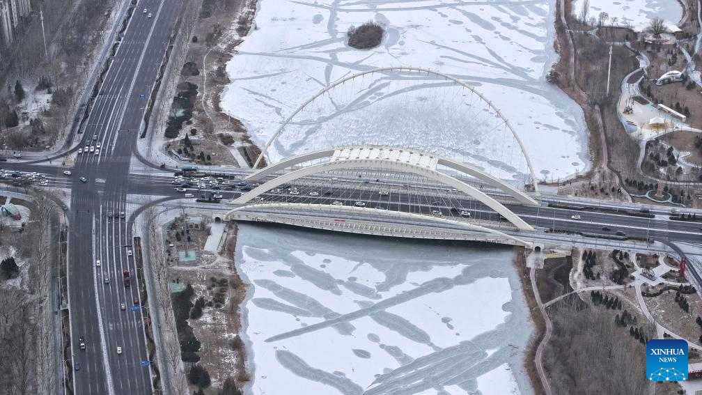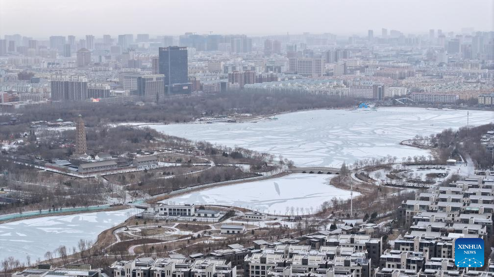 YINCHUAN, 11 enero, 2025 (Xinhua) -- Vista aérea tomada con un dron el 11 de enero de 2025 de un paisaje nevado, en Yinchuan, en la región autónoma de la etnia hui de Ningxia, en el noroeste de China. (Xinhua/Wang Peng)