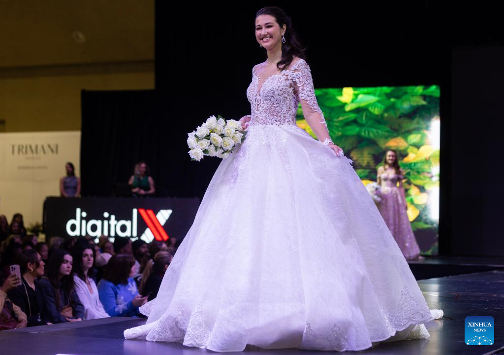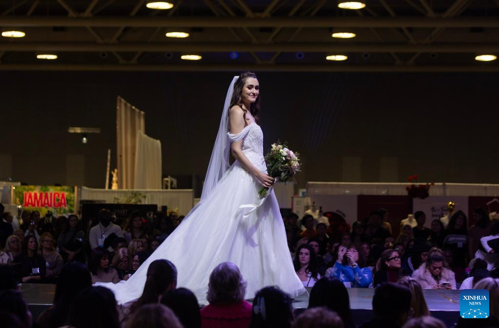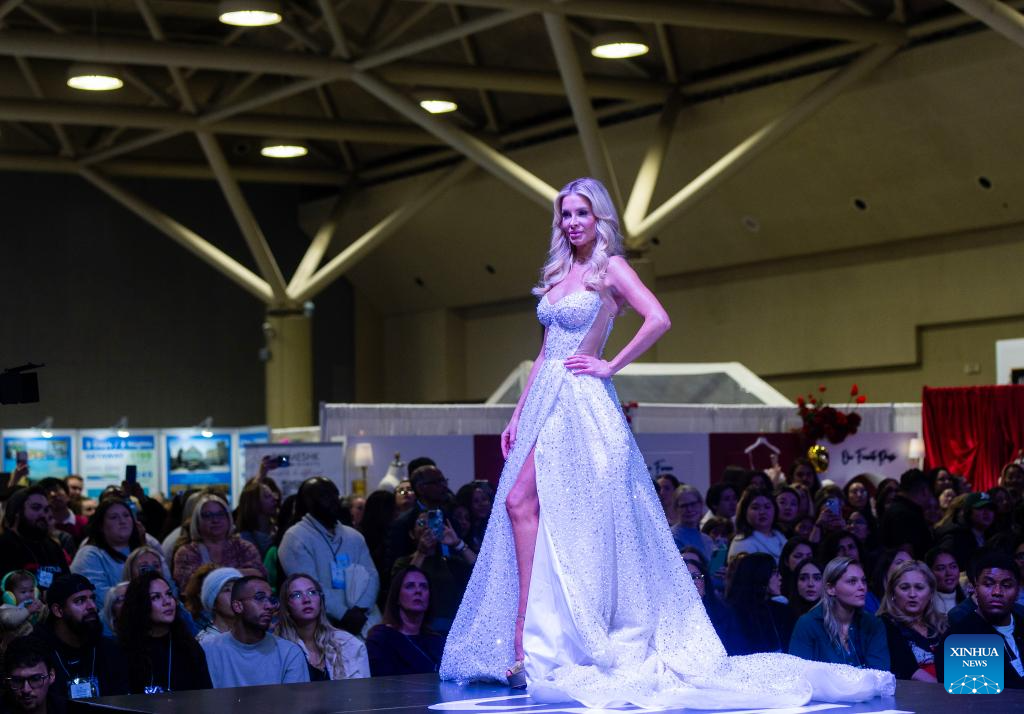 TORONTO, 12 enero, 2025 (Xinhua) -- Imagen del 11 de enero de 2025 de una modelo presentando un vestido de novia durante el Desfile Nupcial de Canadá 2025, en Toronto, Canadá. Mostrando las últimas tendencias en moda nupcial, este evento anual dura del 10 al 12 de enero. (Xinhua/Zou Zheng)