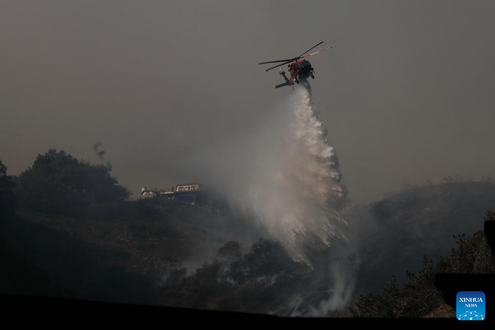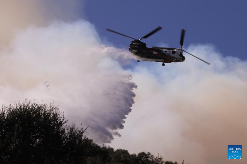 LOS ANGELES, 12 enero, 2025 (Xinhua) -- Imagen del 11 de enero de 2025 de un helicóptero de extinción de incendios, soltando agua para prevenir que el incendio forestal se propague más hacia las colinas del Cañón Mandeville, en Los Angeles, California, Estados Unidos. Al menos 16 personas han muerto por el fuego mientras miles de bomberos apuran su batalla contra la propagación de las llamas por todo el condado de Los Angeles, el más poblado de Estados Unidos, dijeron el sábado las autoridades locales. (Xinhua/Qiu Chen)