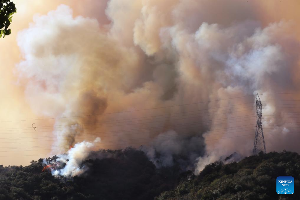 LOS ANGELES, 12 enero, 2025 (Xinhua) -- Imagen del 11 de enero de 2025 del denso humo y llamas del incendio forestal vistos en la cima de las colinas del Cañón Mandeville, en Los Angeles, California, Estados Unidos. Al menos 16 personas han muerto por el fuego mientras miles de bomberos apuran su batalla contra la propagación de las llamas por todo el condado de Los Angeles, el más poblado de Estados Unidos, dijeron el sábado las autoridades locales. (Xinhua/Qiu Chen)