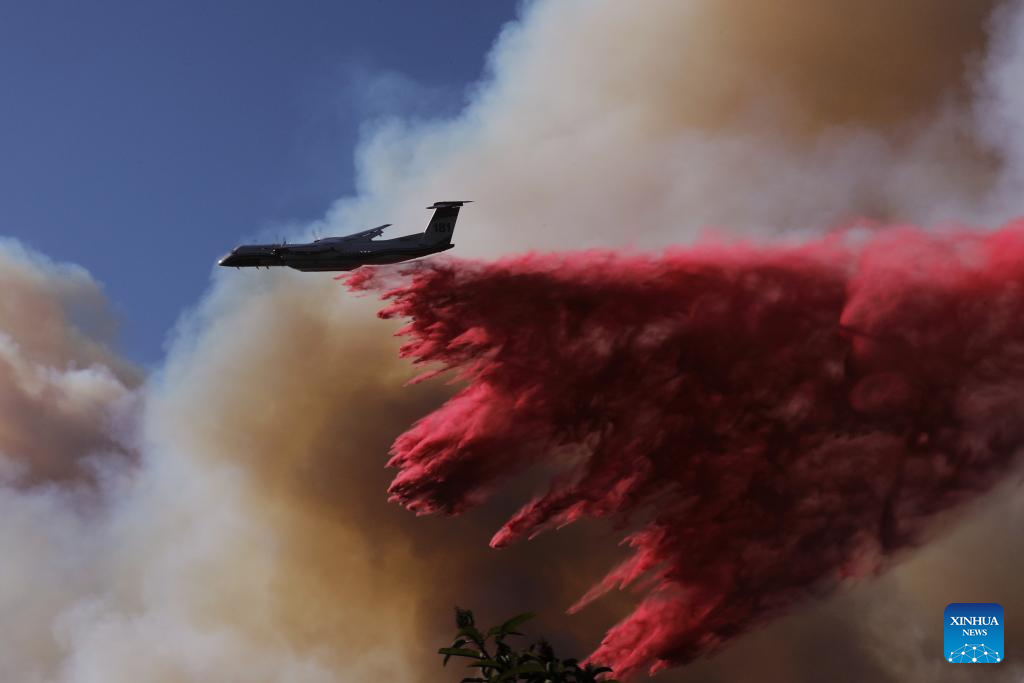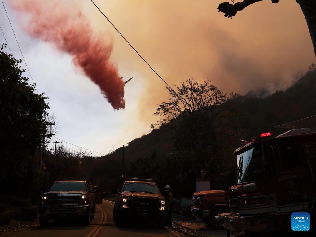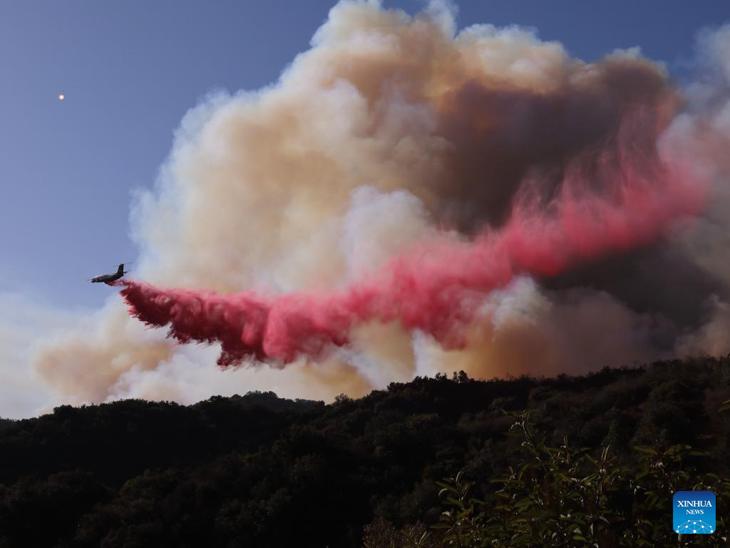 LOS ANGELES, 12 enero, 2025 (Xinhua) -- Imagen del 11 de enero de 2025 de un avión de extinción de incendios, soltando retardante para prevenir que el incendio forestal se propague más hacia las colinas del Cañón Mandeville, en Los Angeles, California, Estados Unidos. Al menos 16 personas han muerto por el fuego mientras miles de bomberos apuran su batalla contra la propagación de las llamas por todo el condado de Los Angeles, el más poblado de Estados Unidos, dijeron el sábado las autoridades locales. (Xinhua/Qiu Chen)