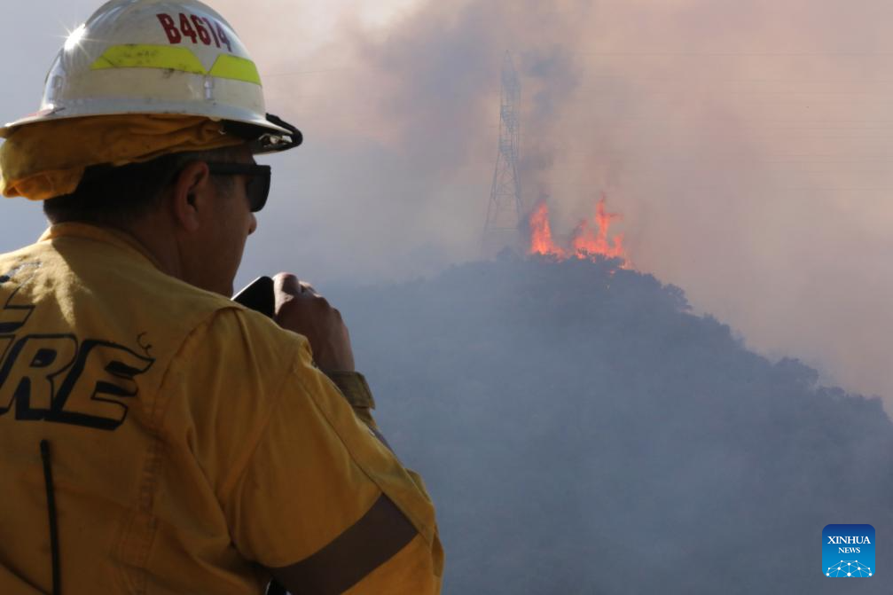 LOS ANGELES, 12 enero, 2025 (Xinhua) -- Imagen del 11 de enero de 2025 de un bombero observando el incendio forestal en la cima de una colina del Cañón Mandeville, en Los Angeles, California, Estados Unidos. Al menos 16 personas han muerto por el fuego mientras miles de bomberos apuran su batalla contra la propagación de las llamas por todo el condado de Los Angeles, el más poblado de Estados Unidos, dijeron el sábado las autoridades locales. (Xinhua/Qiu Chen)