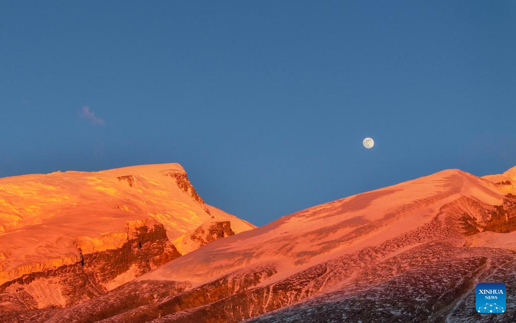 TAXKORGAN, 13 enero, 2025 (Xinhua) -- Imagen tomada con un dron el 12 de enero de 2025 del monte Muztagata al atardecer, en la región autónoma uygur de Xinjiang, en el noroeste de China. (Xinhua/Chen Shuo)