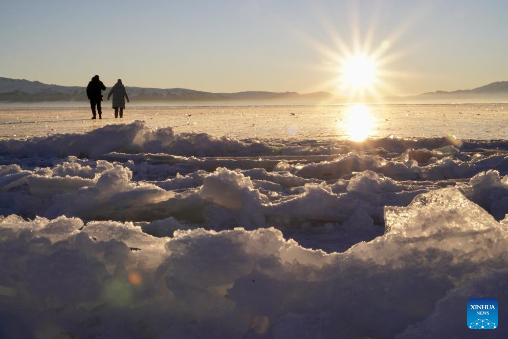 BORTALA, 13 enero, 2025 (Xinhua) -- Turistas caminan en la superficie congelada del lago Sayram al atardecer, en la prefectura autónoma mongola de Bortala, en la región autónoma uygur de Xinjiang, en el noroeste de China, el 13 de enero de 2025. El lago Sayram es el lago alpino más grande y más alto de Xinjiang. (Xinhua/Du Juanjuan)