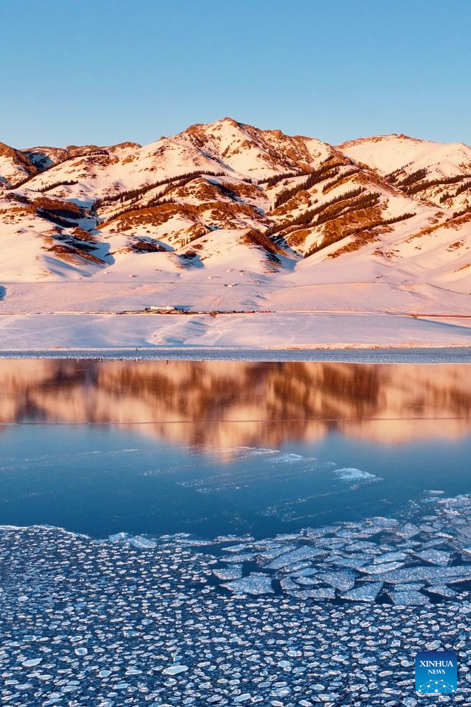 BORTALA, 13 enero, 2025 (Xinhua) -- Imagen tomada con un dron el 13 de enero de 2025 del lago Sayram al atardecer, en la prefectura autónoma mongola de Bortala, en la región autónoma uygur de Xinjiang, en el noroeste de China. El lago Sayram es el lago alpino más grande y más alto de Xinjiang. (Xinhua/Du Juanjuan)
