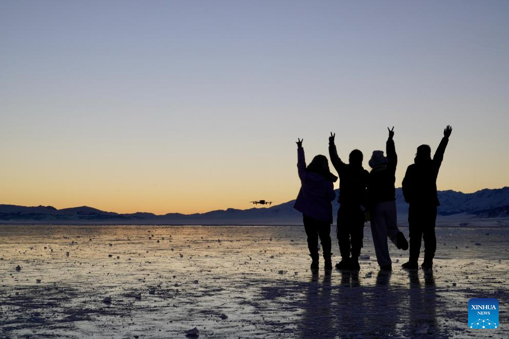 BORTALA, 13 enero, 2025 (Xinhua) -- Turistas toman fotografías con un dron en la superficie congelada del lago Sayram al atardecer, en la prefectura autónoma mongola de Bortala, en la región autónoma uygur de Xinjiang, en el noroeste de China, el 13 de enero de 2025. El lago Sayram es el lago alpino más grande y más alto de Xinjiang. (Xinhua/Du Juanjuan)