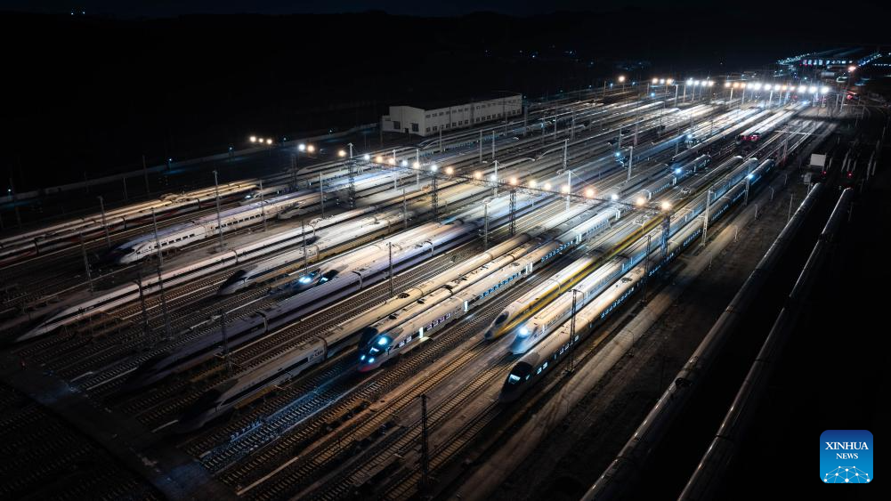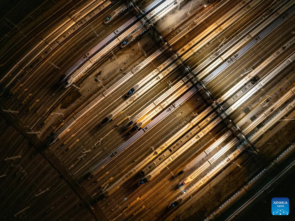GUIYANG, 13 enero, 2025 (Xinhua) -- Vista aérea tomada con un dron el 13 de enero de 2025 de trenes bala en una base de mantenimiento, en Guiyang, en la provincia de Guizhou, en el suroeste de China. La temporada alta de viajes por el Festival de Primavera de este año comenzará el 14 de enero. (Xinhua/Liu Xu)