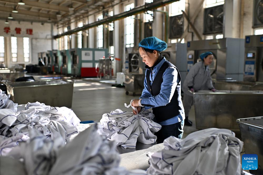 TAIYUAN, 13 enero, 2025 (Xinhua) -- Imagen del 9 de enero de 2025 de una empleada de lavandería acomodando ropa de cama en un centro de lavado y abastecimiento bajo el China Railway Taiyuan Group Co., Ltd., en Jinzhong, en la provincia de Shanxi, en el norte de China. El Festival de Primavera, que marca el comienzo de un nuevo año en el calendario lunar chino, se caracteriza por sus reuniones familiares masivas y un incremento en los viajes. Para garantizar un viaje seguro, tranquilo y cómodo para los pasajeros durante la próxima temporada alta de viajes por el Festival de Primavera, un gran número de empleados del ferrocarril trabajan con su máximo esfuerzo para prepararse para este ocupado periodo del año. La temporada alta de viajes por el Festival de Primavera de este año comenzará el 14 de enero. (Xinhua/Zhan Yan)