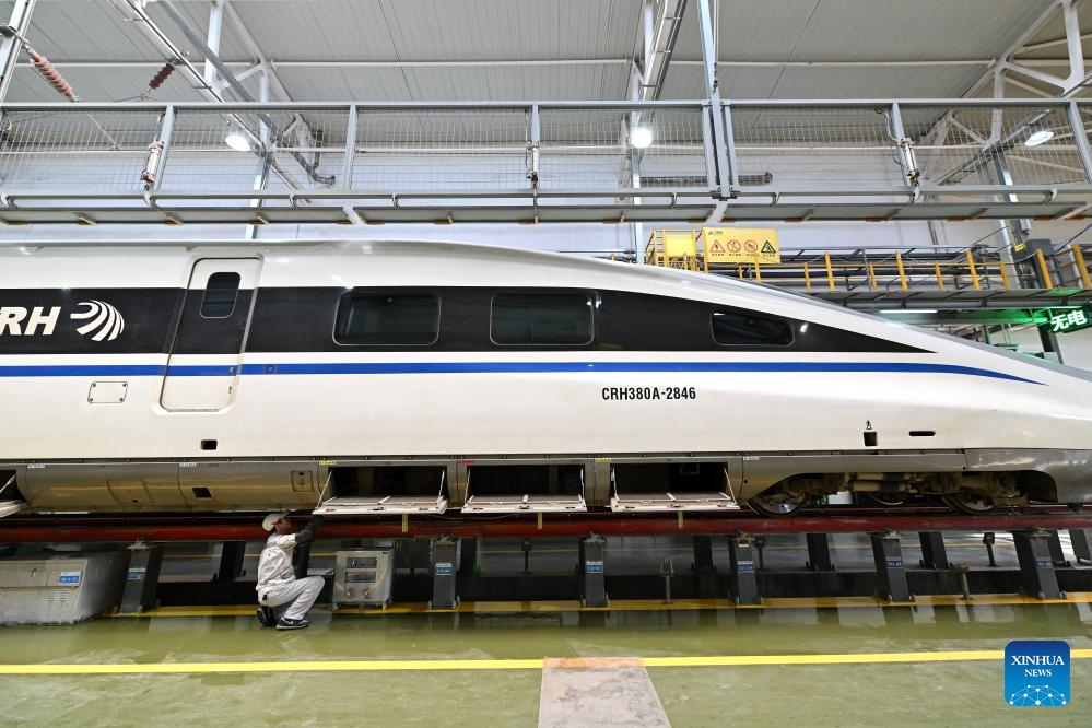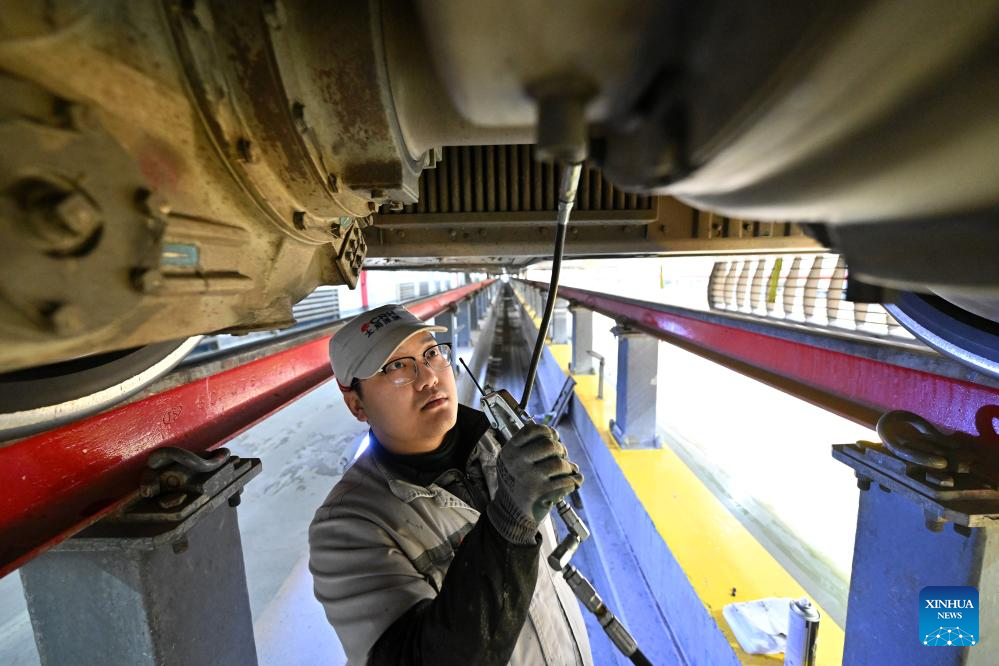 TAIYUAN, 13 enero, 2025 (Xinhua) -- Imagen del 9 de enero de 2025 del mecánico Li Zhenhe trabajando en el mantenimiento de un tren bala en un centro de mantenimiento a unidades eléctricas múltiples, en Jinzhong, en la provincia de Shanxi, en el norte de China. El Festival de Primavera, que marca el comienzo de un nuevo año en el calendario lunar chino, se caracteriza por sus reuniones familiares masivas y un incremento en los viajes. Para garantizar un viaje seguro, tranquilo y cómodo para los pasajeros durante la próxima temporada alta de viajes por el Festival de Primavera, un gran número de empleados del ferrocarril trabajan con su máximo esfuerzo para prepararse para este ocupado periodo del año. La temporada alta de viajes por el Festival de Primavera de este año comenzará el 14 de enero. (Xinhua/Zhan Yan)