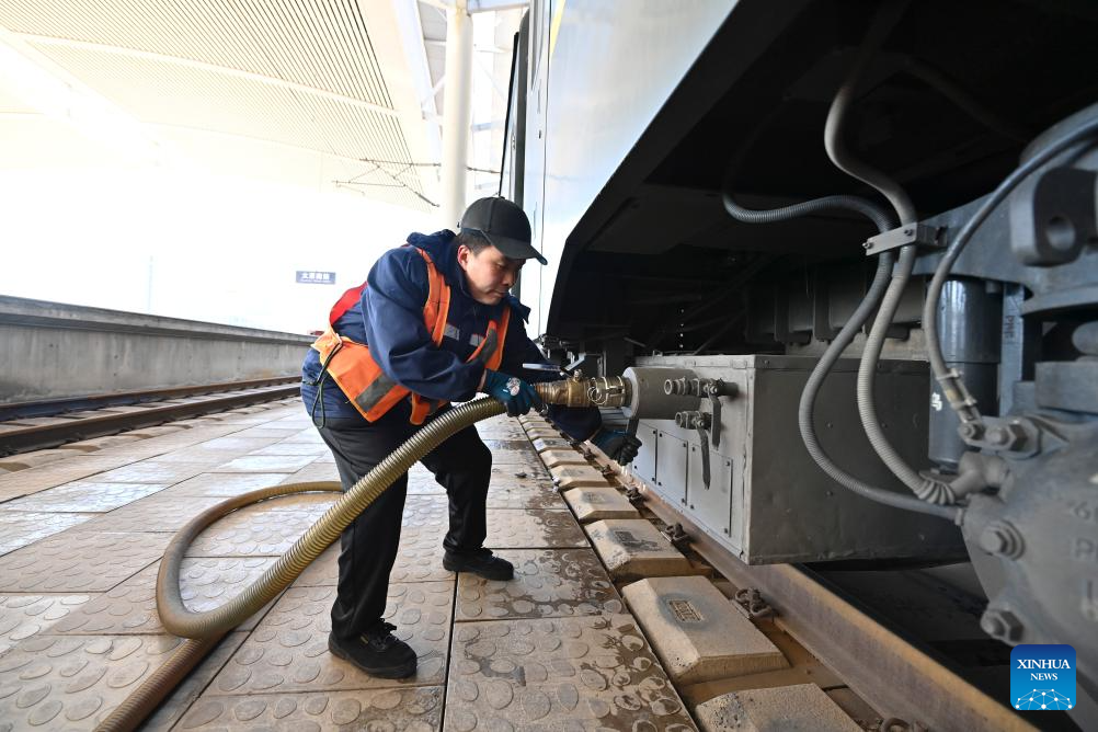 TAIYUAN, 13 enero, 2025 (Xinhua) -- Imagen del 9 de enero de 2025 del empleado del ferrocarril Wu Yunlong realizando la succión de drenaje en la Estación de Ferrocarril Sur de Taiyuan, en Taiyuan, en la provincia de Shanxi, en el norte de China. El Festival de Primavera, que marca el comienzo de un nuevo año en el calendario lunar chino, se caracteriza por sus reuniones familiares masivas y un incremento en los viajes. Para garantizar un viaje seguro, tranquilo y cómodo para los pasajeros durante la próxima temporada alta de viajes por el Festival de Primavera, un gran número de empleados del ferrocarril trabajan con su máximo esfuerzo para prepararse para este ocupado periodo del año. La temporada alta de viajes por el Festival de Primavera de este año comenzará el 14 de enero. (Xinhua/Yang Chenguang)