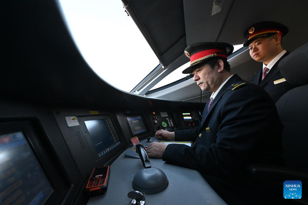 TAIYUAN, 13 enero, 2025 (Xinhua) -- Imagen del 10 de enero de 2025 de los conductores de tren de alta velocidad, Ma Xiaodong (i), y Yang Tianyu, revisando las instalaciones en el interior de un tren bala, en un centro de mantenimiento a unidades eléctricas múltiples, en Jinzhong, en la provincia de Shanxi, en el norte de China. El Festival de Primavera, que marca el comienzo de un nuevo año en el calendario lunar chino, se caracteriza por sus reuniones familiares masivas y un incremento en los viajes. Para garantizar un viaje seguro, tranquilo y cómodo para los pasajeros durante la próxima temporada alta de viajes por el Festival de Primavera, un gran número de empleados del ferrocarril trabajan con su máximo esfuerzo para prepararse para este ocupado periodo del año. La temporada alta de viajes por el Festival de Primavera de este año comenzará el 14 de enero. (Xinhua/Zhan Yan)