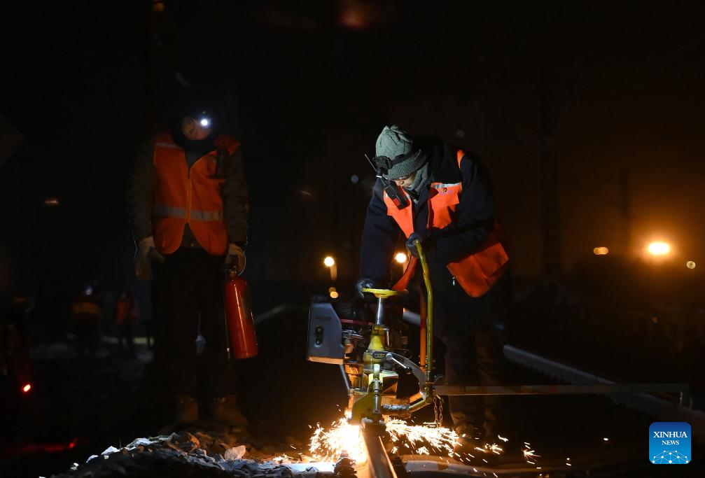 TAIYUAN, 13 enero, 2025 (Xinhua) -- Imagen del 9 de enero de 2025 del empleado de mantenimiento Liang Xiaogang (d) llevando a cabo un operativo de mantenimiento para ferrocarriles, en la ciudad de Lyuliang, en la provincia de Shanxi, en el norte de China. El Festival de Primavera, que marca el comienzo de un nuevo año en el calendario lunar chino, se caracteriza por sus reuniones familiares masivas y un incremento en los viajes. Para garantizar un viaje seguro, tranquilo y cómodo para los pasajeros durante la próxima temporada alta de viajes por el Festival de Primavera, un gran número de empleados del ferrocarril trabajan con su máximo esfuerzo para prepararse para este ocupado periodo del año. La temporada alta de viajes por el Festival de Primavera de este año comenzará el 14 de enero. (Xinhua/Liu Liangliang)