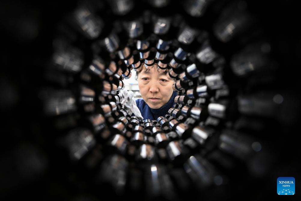 TAIYUAN, 13 enero, 2025 (Xinhua) -- Imagen del 9 de enero de 2025 del montador de vehículos Li Weiping revisando el eje en el taller de ruedas y ejes bajo el China Railway Taiyuan Group Co., Ltd., en Taiyuan, en la provincia de Shanxi, en el norte de China. El Festival de Primavera, que marca el comienzo de un nuevo año en el calendario lunar chino, se caracteriza por sus reuniones familiares masivas y un incremento en los viajes. Para garantizar un viaje seguro, tranquilo y cómodo para los pasajeros durante la próxima temporada alta de viajes por el Festival de Primavera, un gran número de empleados del ferrocarril trabajan con su máximo esfuerzo para prepararse para este ocupado periodo del año. La temporada alta de viajes por el Festival de Primavera de este año comenzará el 14 de enero. (Xinhua/Yang Chenguang)