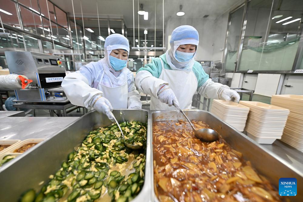 TAIYUAN, 13 enero, 2025 (Xinhua) -- Imagen del 9 de enero de 2025 de empleadas empaquetando alimentos en un centro de lavado y abastecimiento de China Railway Taiyuan Group Co., Ltd., en Jinzhong, en la provincia de Shanxi, en el norte de China. El Festival de Primavera, que marca el comienzo de un nuevo año en el calendario lunar chino, se caracteriza por sus reuniones familiares masivas y un incremento en los viajes. Para garantizar un viaje seguro, tranquilo y cómodo para los pasajeros durante la próxima temporada alta de viajes por el Festival de Primavera, un gran número de empleados del ferrocarril trabajan con su máximo esfuerzo para prepararse para este ocupado periodo del año. La temporada alta de viajes por el Festival de Primavera de este año comenzará el 14 de enero. (Xinhua/Zhan Yan)