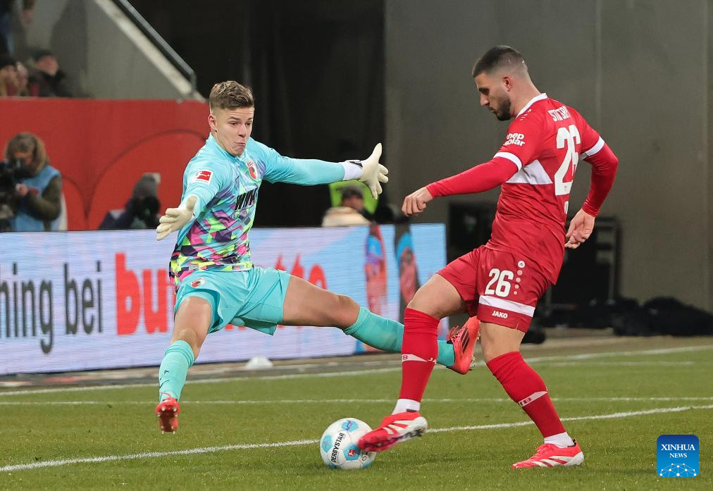 AUGSBURGO, 13 enero, 2025 (Xinhua) -- Imagen del 12 de enero de 2025 de Deniz Undav (d), de VfB Stuttgart, realizando una anotación ante el guardameta Finn Dahmen, de FC Augsburgo, durante el partido de fútbol de la primera división alemana de la Bundesliga entre FC Augsburgo y VfB Stuttgart, en Augsburgo, Alemania. (Xinhua/Philippe Ruiz)
