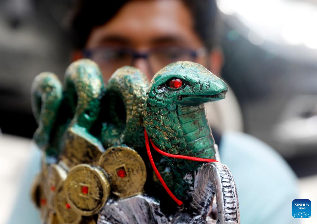 LIMA, 14 enero, 2025 (Xinhua) -- Un vendedor muestra una figura de una serpiente para su venta con motivo de los festejos por el Año Nuevo chino de la Serpiente, en el Barrio Chino, en el centro de Lima, Perú, el 14 de enero de 2025. (Xinhua/Mariana Bazo)