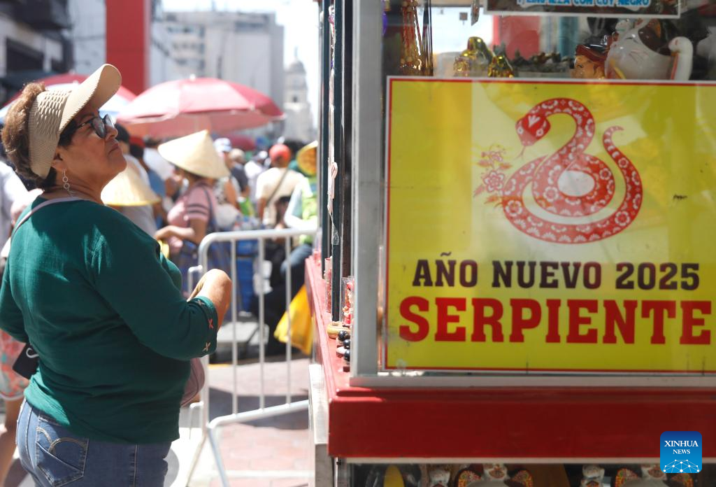LIMA, 14 enero, 2025 (Xinhua) -- Una mujer observa objetos previo a los festejos por el Año Nuevo chino de la Serpiente, en el Barrio Chino, en el centro de Lima, Perú, el 14 de enero de 2025. (Xinhua/Mariana Bazo)