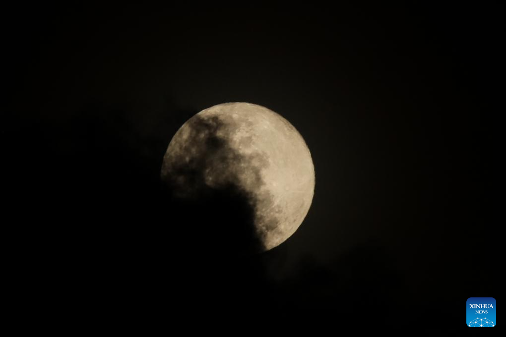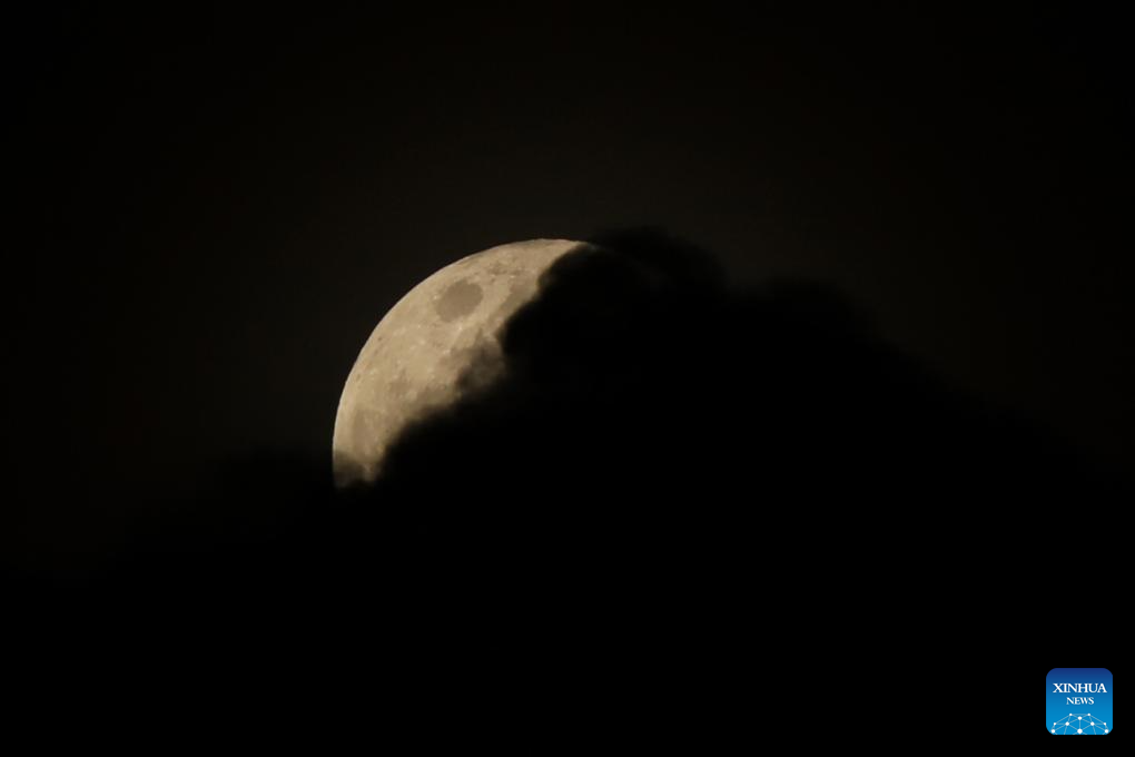SAN SALVADOR, 14 enero, 2025 (Xinhua) -- Imagen del 13 de enero de 2025 de la primera luna llena de 2025, conocida como Luna de Lobo, vista entre nubes, en el departamento de San Salvador, El Salvador. (Xinhua/Alexander Peña)