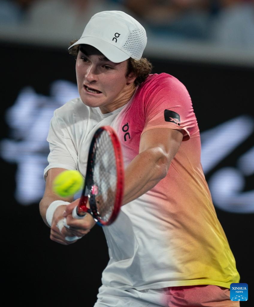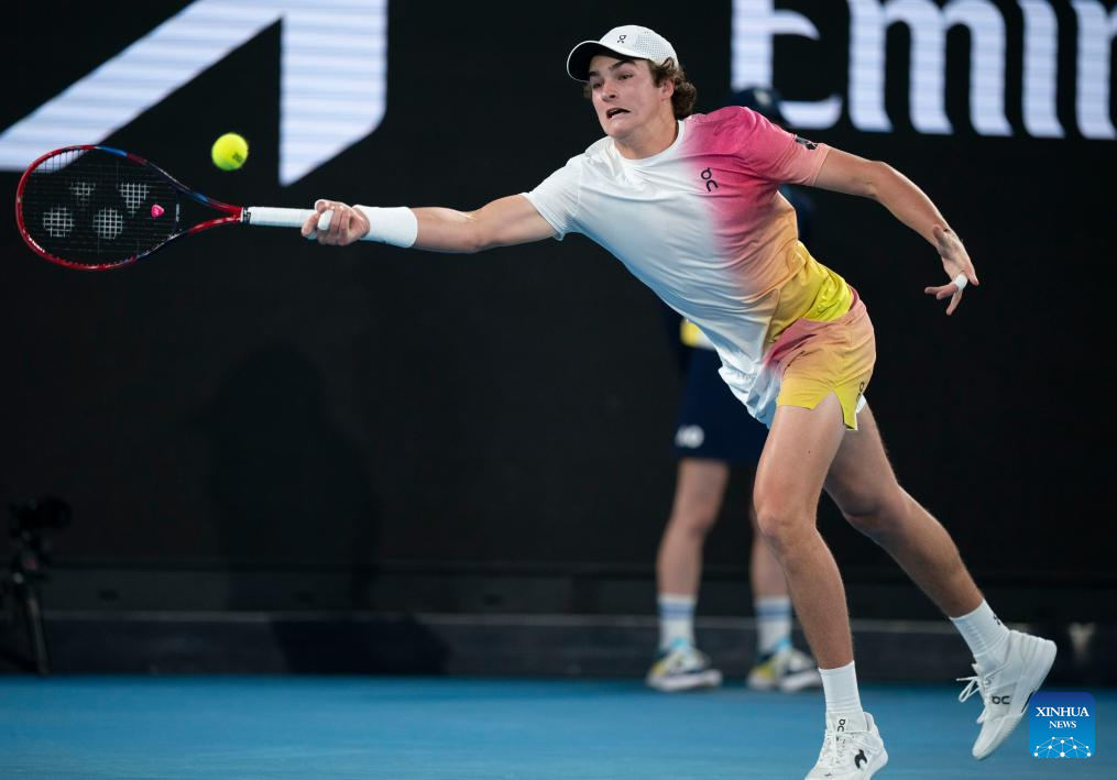 MELBOURNE, 14 enero, 2025 (Xinhua) -- Joao Fonseca devuelve la pelota durante el partido de individuales masculinos de primera ronda entre Joao Fonseca, de Brasil, y Andrey Rublev, de Rusia, en el torneo de tenis Abierto de Australia, en Melbourne, Australia, el 14 de enero de 2025. (Xinhua/Lui Siu Wai)