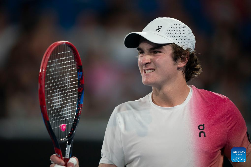 MELBOURNE, 14 enero, 2025 (Xinhua) -- Joao Fonseca reacciona durante el partido de individuales masculinos de primera ronda entre Joao Fonseca, de Brasil, y Andrey Rublev, de Rusia, en el torneo de tenis Abierto de Australia, en Melbourne, Australia, el 14 de enero de 2025. (Xinhua/Lui Siu Wai)