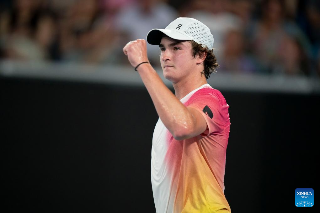 MELBOURNE, 14 enero, 2025 (Xinhua) -- Joao Fonseca festeja durante el partido de individuales masculinos de primera ronda entre Joao Fonseca, de Brasil, y Andrey Rublev, de Rusia, en el torneo de tenis Abierto de Australia, en Melbourne, Australia, el 14 de enero de 2025. (Xinhua/Lui Siu Wai)