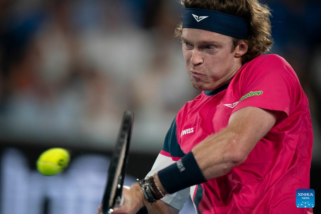 MELBOURNE, 14 enero, 2025 (Xinhua) -- Andrey Rublev devuelve la pelota durante el partido de individuales masculinos de primera ronda entre Joao Fonseca, de Brasil, y Andrey Rublev, de Rusia, en el torneo de tenis Abierto de Australia, en Melbourne, Australia, el 14 de enero de 2025. (Xinhua/Lui Siu Wai)
