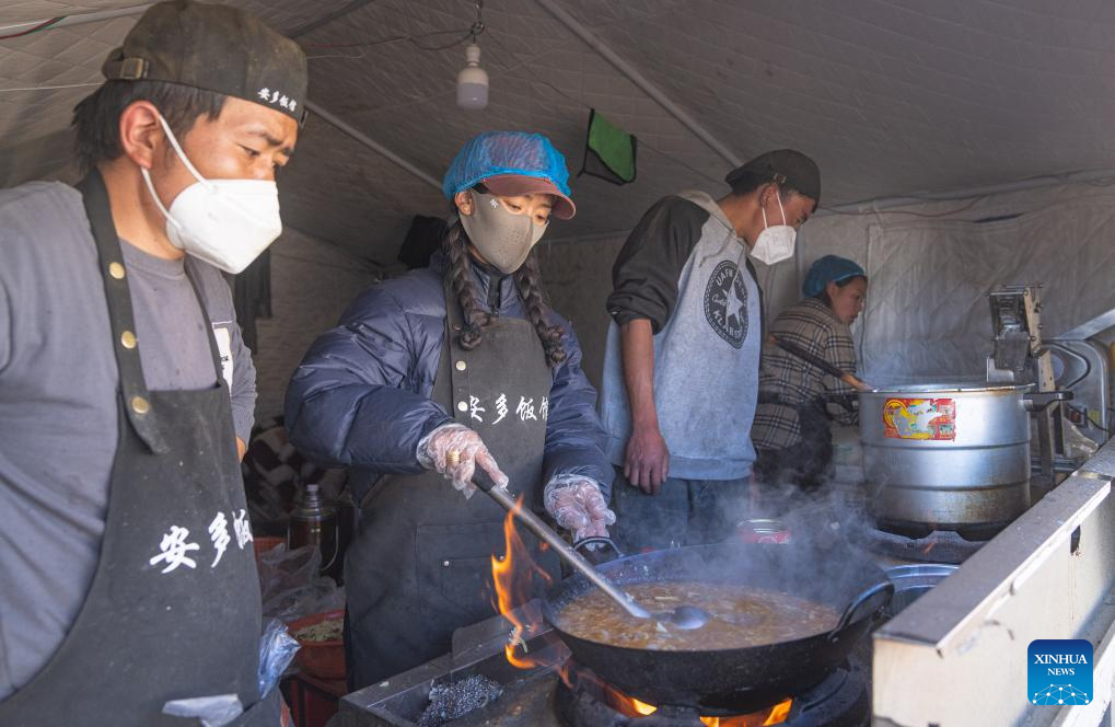 DINGRI, 14 enero, 2025 (Xinhua) -- Imagen del 13 de enero de 2025 de cocineros de un restaurante local cocinando para los afectados por el terremoto, en la aldea de Gurum, en el poblado de Chamco del distrito de Dingri, en Xigaze, en la región autónoma de Xizang, en el suroeste de China. El 7 de enero, un terremoto de magnitud 6,8 sacudió Dingri, hogar del campamento base norte del pico más alto del mundo, el monte Qomolangma. Actualmente, las autoridades locales y los equipos de rescate están ocupados levantando casas improvisadas, permitiendo a los residentes desplazados trasladarse de las tiendas de campaña a viviendas más resistentes a los terremotos. Hasta las 6 p. m. del 12 de enero, se habían instalado alrededor de 2.198 casas improvisadas en varios sitios de reubicación en Dingri, en un esfuerzo por garantizar un invierno seguro y cálido para todos. A medida que avanzan los trabajos de reasentamiento, también se están realizando esfuerzos de remoción de escombros y rescate de propiedades. (Xinhua/Tenzin Nyida)